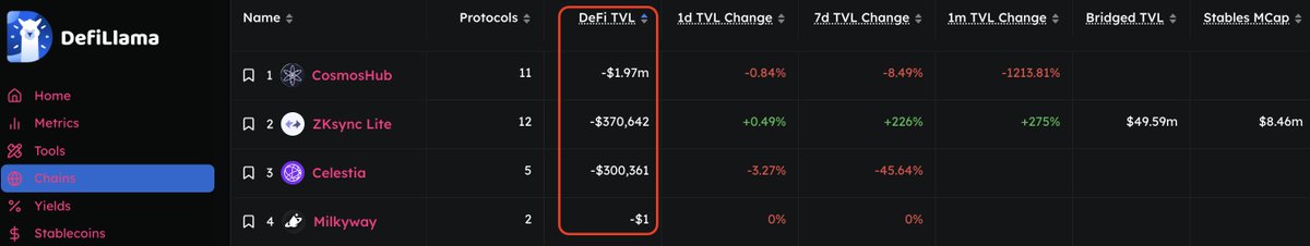 @DefiLlama 把 @cosmoshub , @zksync Lite, @celestia 和 @milky_way_zone 4条链的Defi TVL 标记为负数了。