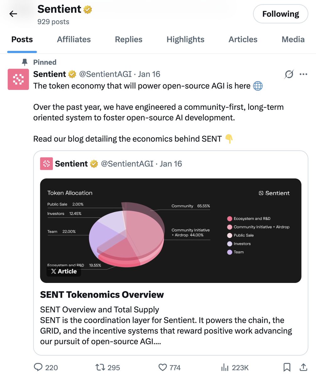 后知后觉Sentient 早在几天前就公布了 $SENT 的代币经济学,大概看了下,代币分配对社区用户还是相对友好的:
