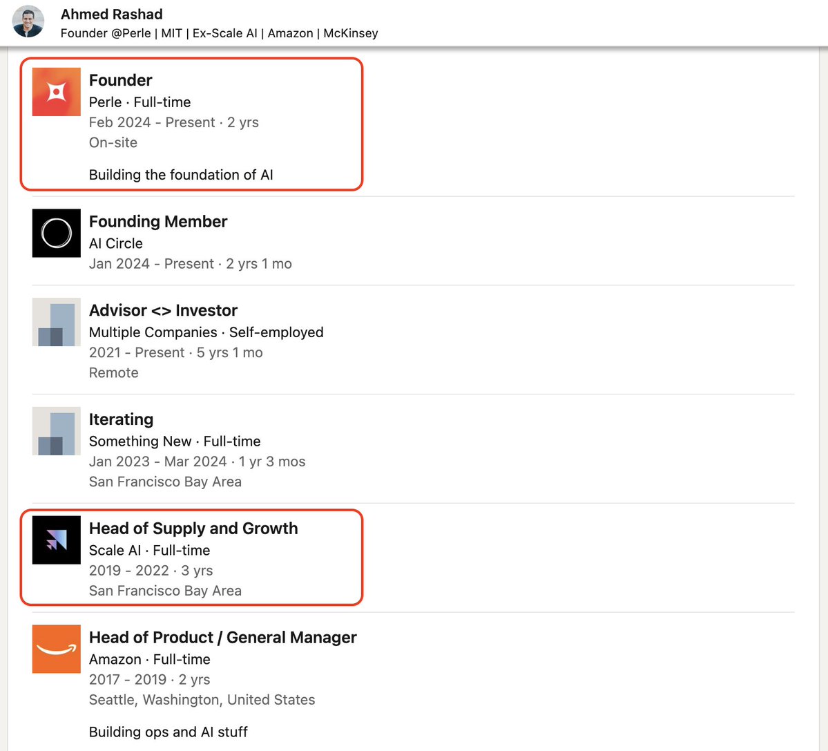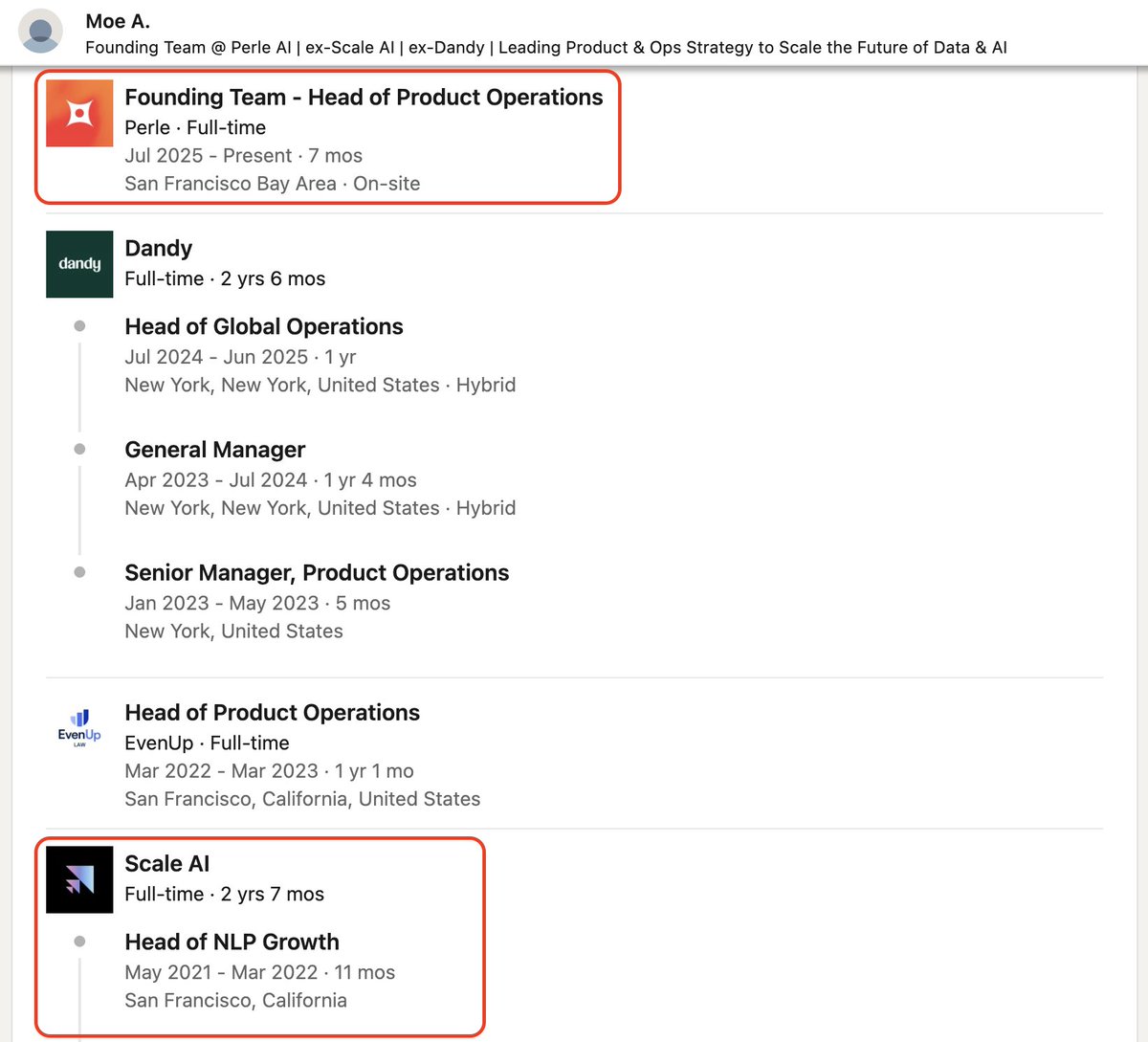Scale AI 是web2 AI 数据infra 赛道的绝对龙头,去年6月Meta 以143亿美元收购公司49% 的股票,让 @scale_AI 成为估值约290亿美元的庞然大物。Perle 核心创始团队成员均来自Scale AI 这所“黄埔军校”,包括创始人 @AhmedZRashad, 运营负责人 Moe Abdelfattah 等。