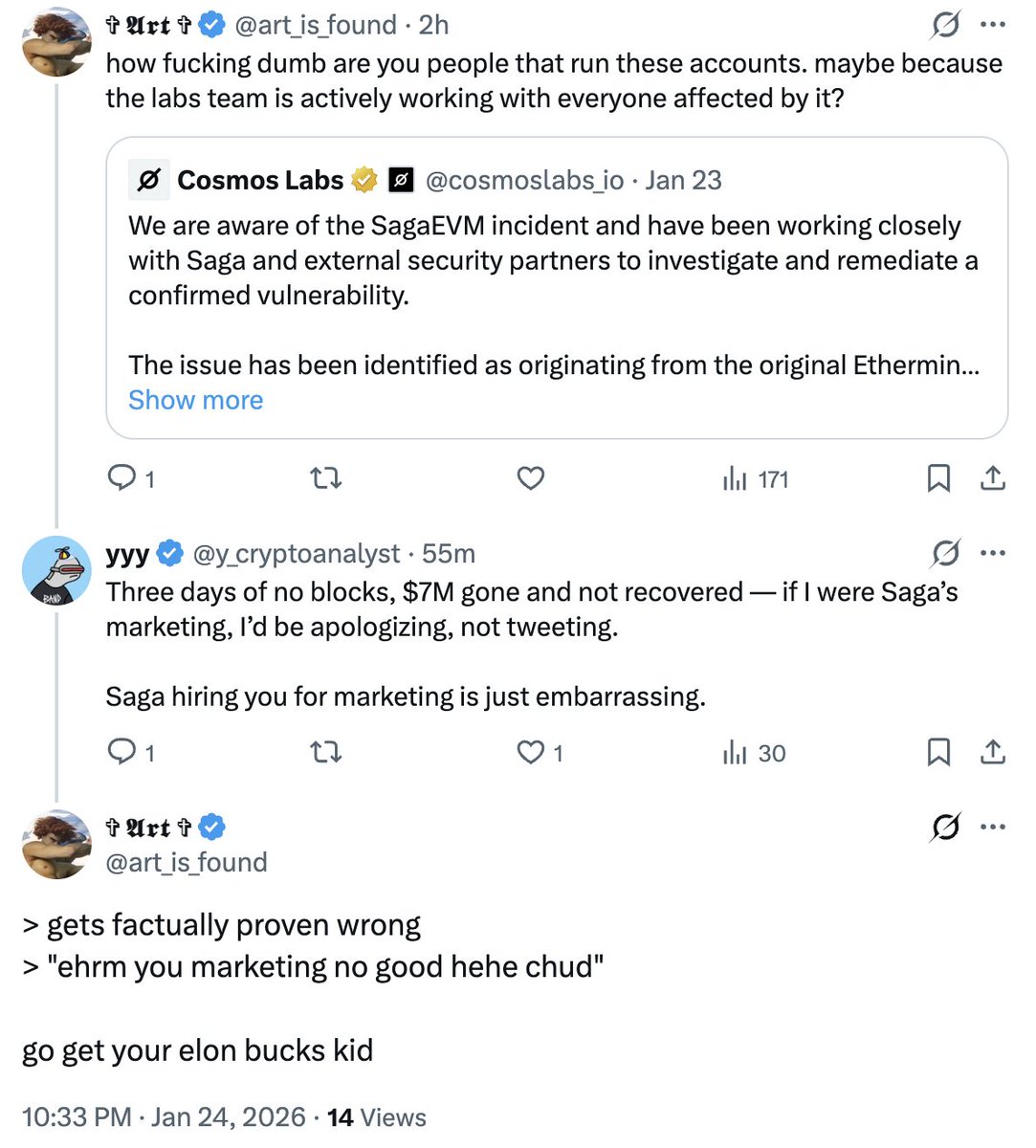 链上被盗700万美元后,主链SagaEVM 已经停止出块27个小时了。