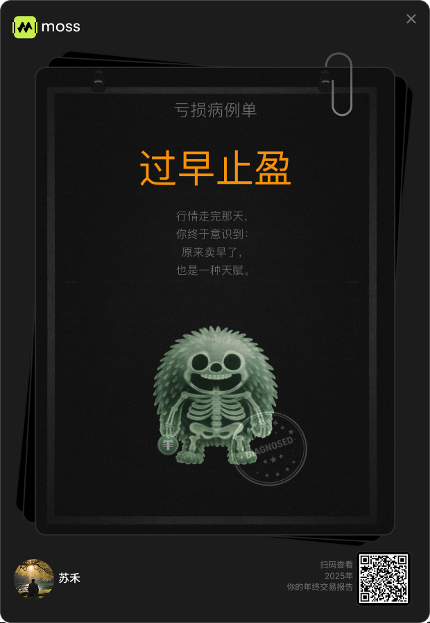 2025年终,不只有网易云的年度报告,Moss也给出了年报,智能化的AI,相比较其他机械式的评价,它更能一针见血的指出问题(更有逻辑、更细节),连我自己都没有意识到,今年最大的问题是没拿住底部筹码,所以到了中高位的延续行情会陷入进退两难的地步。