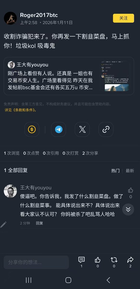 币安广场上看到一个跟 @jager_BSC 项目方tim和loky一样妈妈被人杀了(tim还加个小孩👶🏻被人杀了)的疯狗