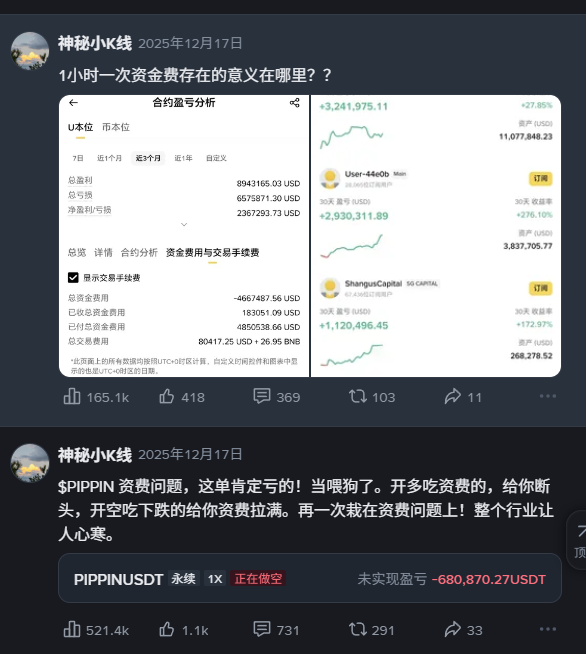 比如币安广场里“神秘的小K线”这三月做空各种妖币资金费率给出去400W U(仅币安一家CEX,他有时候一个币好几家交易所开空的)