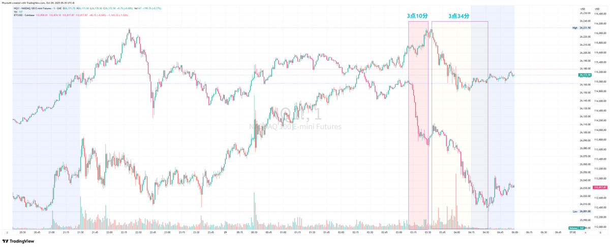 今天作业有点难度啊,主要就是凌晨 $BTC 的下跌,我说说我个人的看法,没有发现任何利空的信息,对比了一下纳指和标普,Bitcoin 的下跌是前置的,3点10分第一段下跌的时候美股的走势还是不错的,3点34分第二段下跌就和美股重合了。
