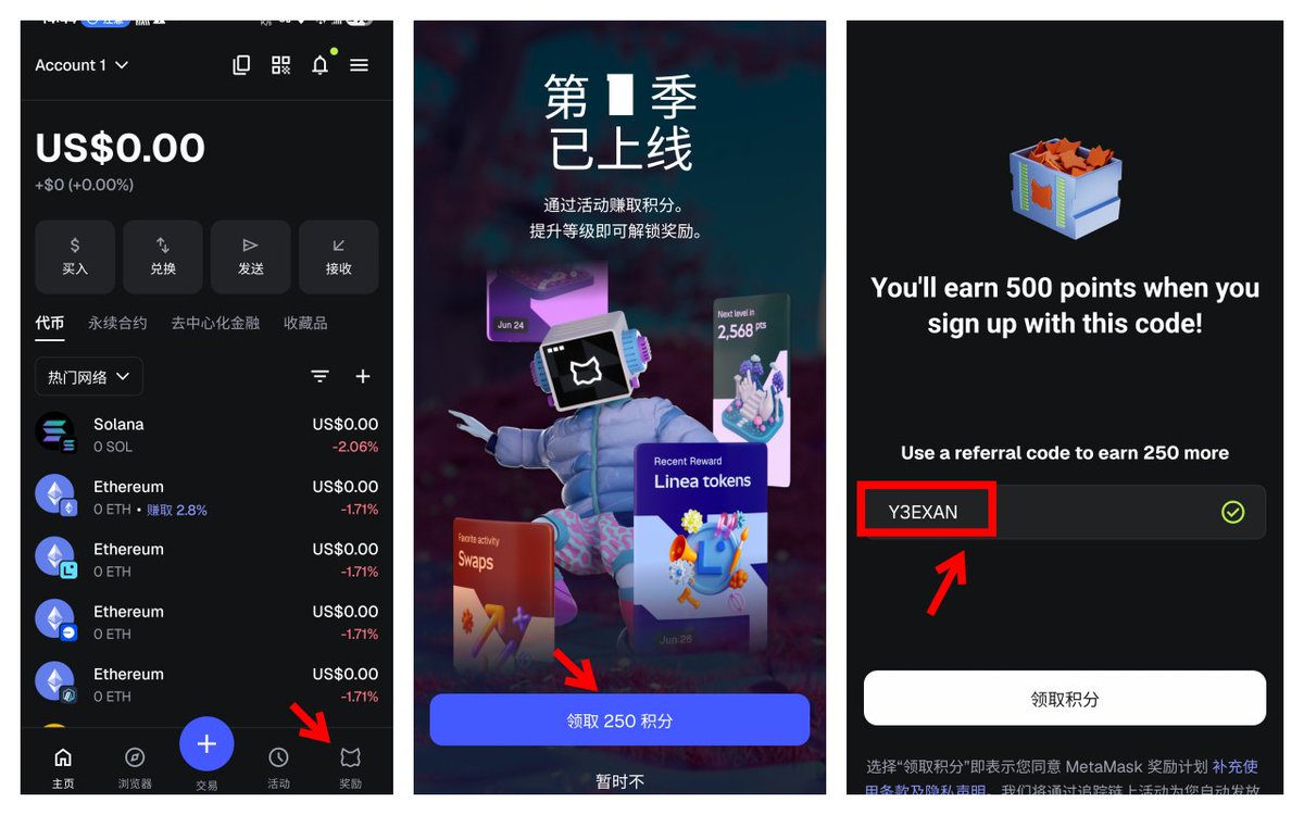2. 打开 MetaMask 移动端应用,如果没有奖励页面需要更新到最新版本