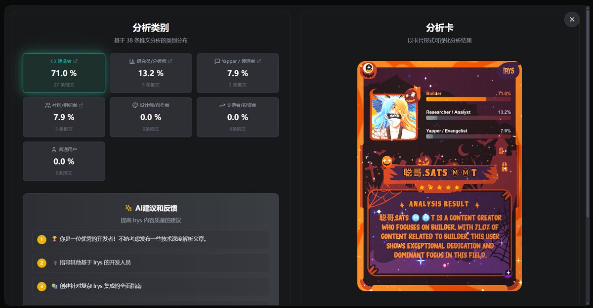 一共有 7 大角色占比,聪哥一共创作了 38 条有关 IRYS 的推文,感觉还挺准的。