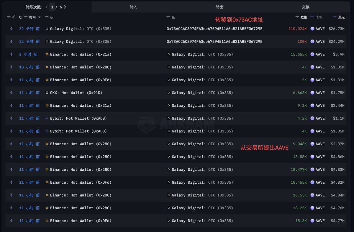 21 万枚 AAVE ($5132 万) 在过去 11 个小时里从 Binance、OKX、Bybit 提出到 Galaxy Digital OTC 钱包,然后在半小时前转到了 0x73AC 地址。