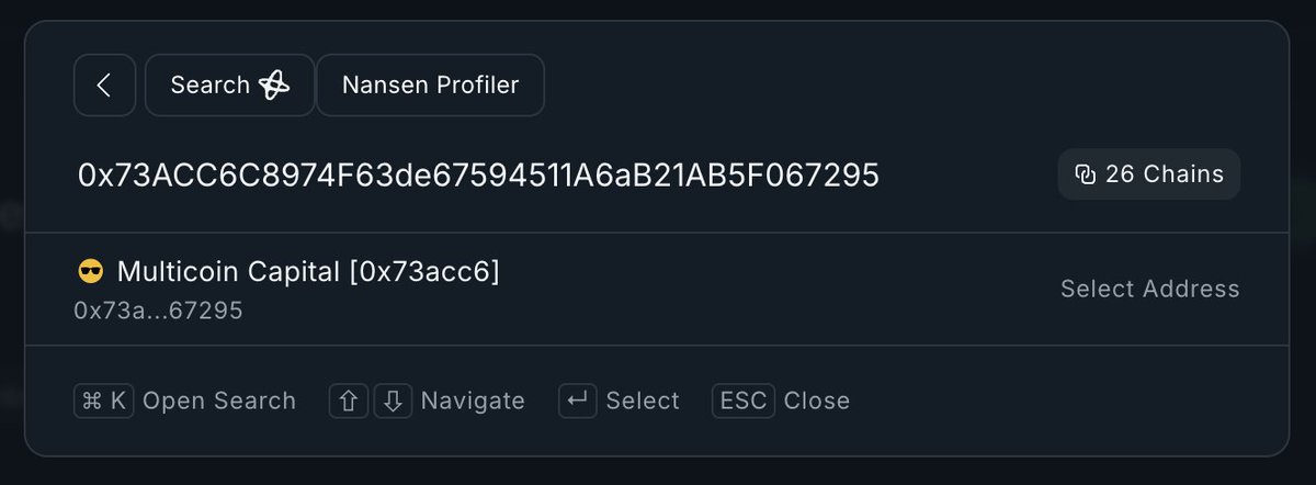 @nansen_ai 上标注 0x73AC 地址属于 Multicoin Capital。