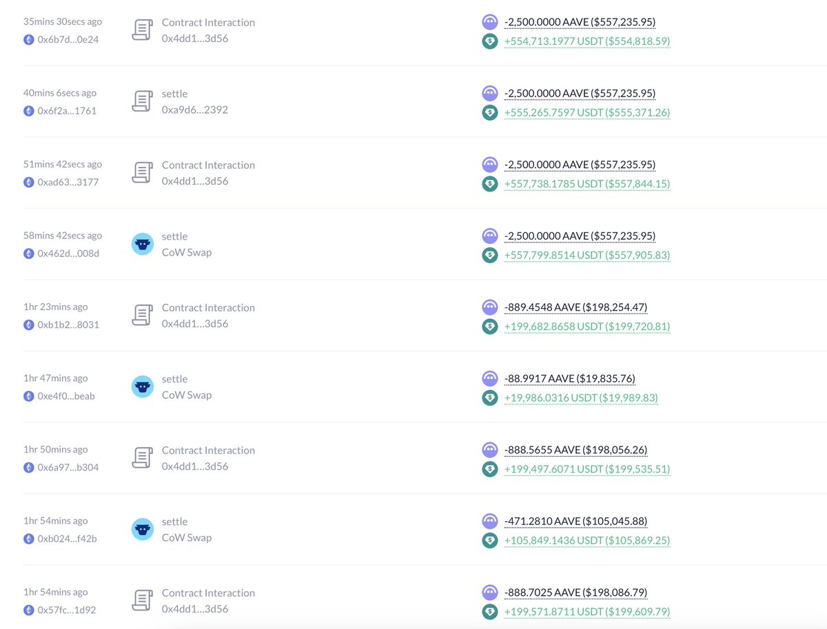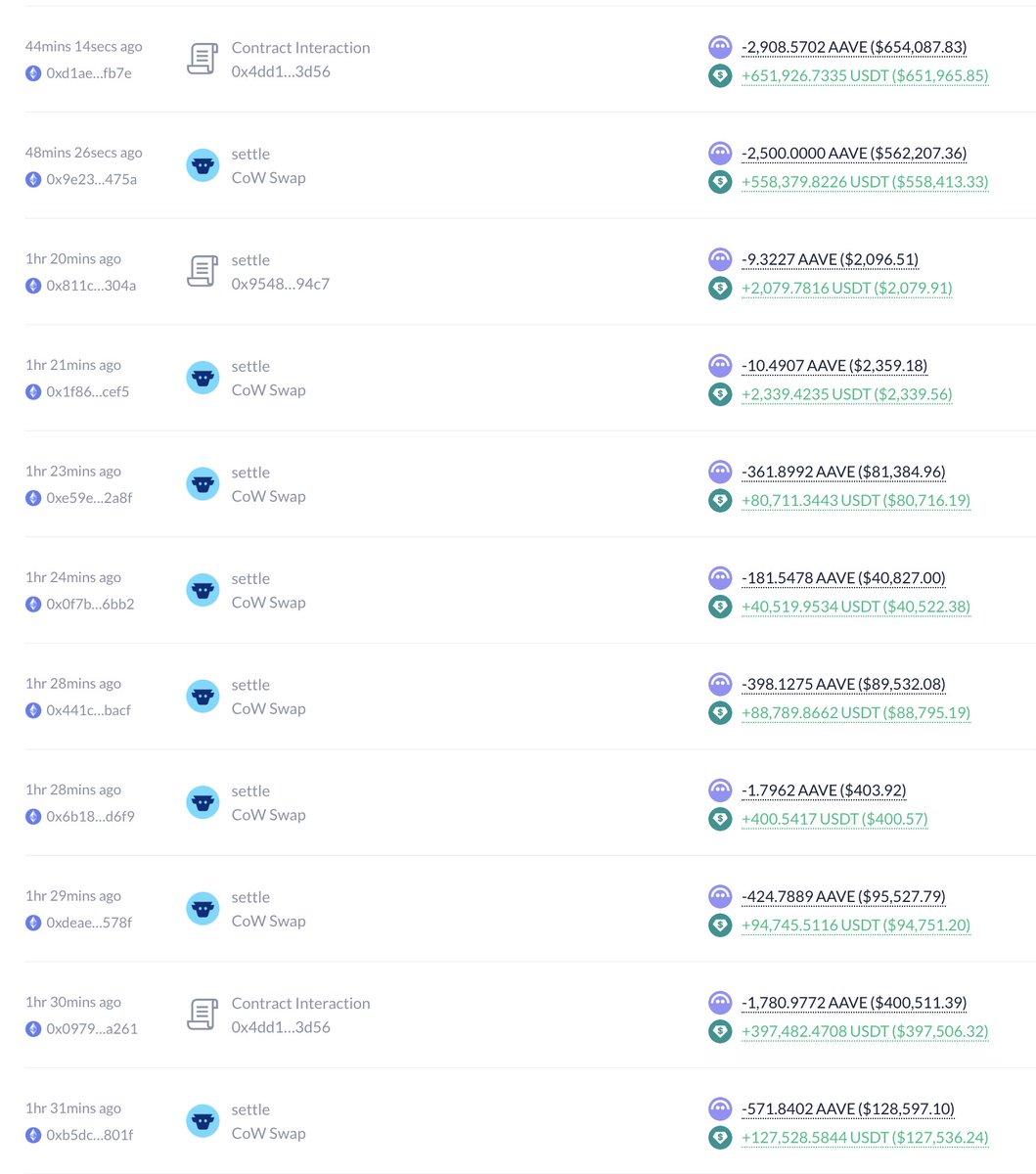 ◎他在过去 4 个小时里,从 Aave 取回 7 万枚 AAVE 以 $223 的均价卖出换成 1562 万 USDC,然后还清了在 Aave 上的借款。