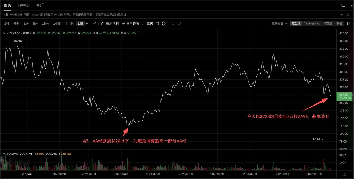 ◎4 月份的时候,他为了这个 AAVE 仓位不被清算掉,还在 $120 左右割肉了一部分 AAVE。