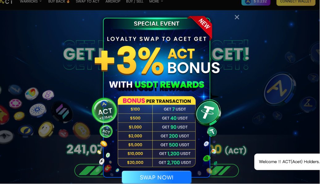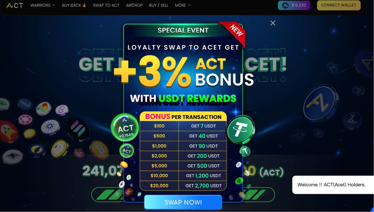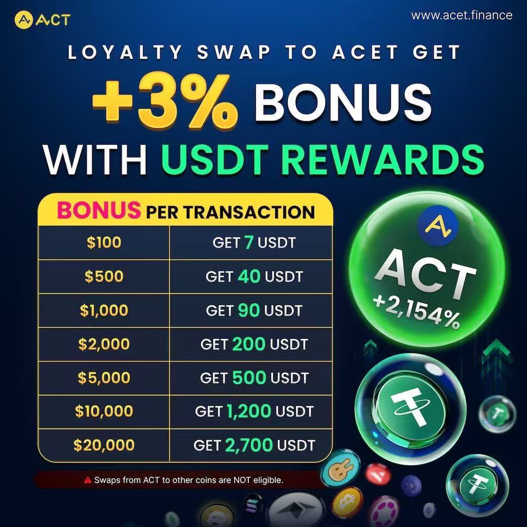 最近合作的项目 @ACTDeFansFi 的 $ACT 兑换活动上线了 把 DOGE、BNB、SHIB 等任意加密货币换成 $ACT,立马拿 3% USDT 回馈 例如: 兑换 $100 = 7 USDT 兑换 $500 = 40 USDT 兑换 $1000 = 90 USDT 参与链接: