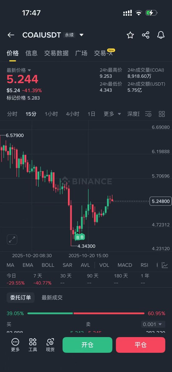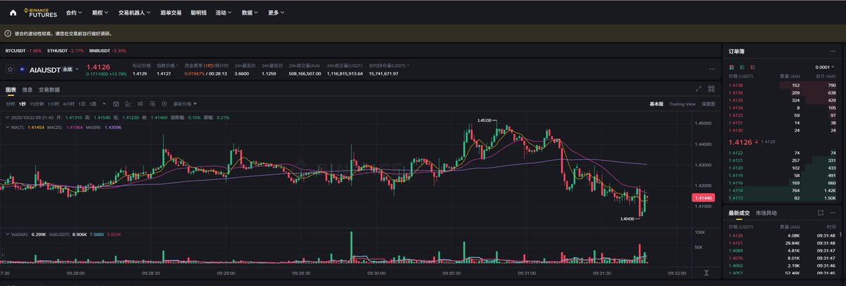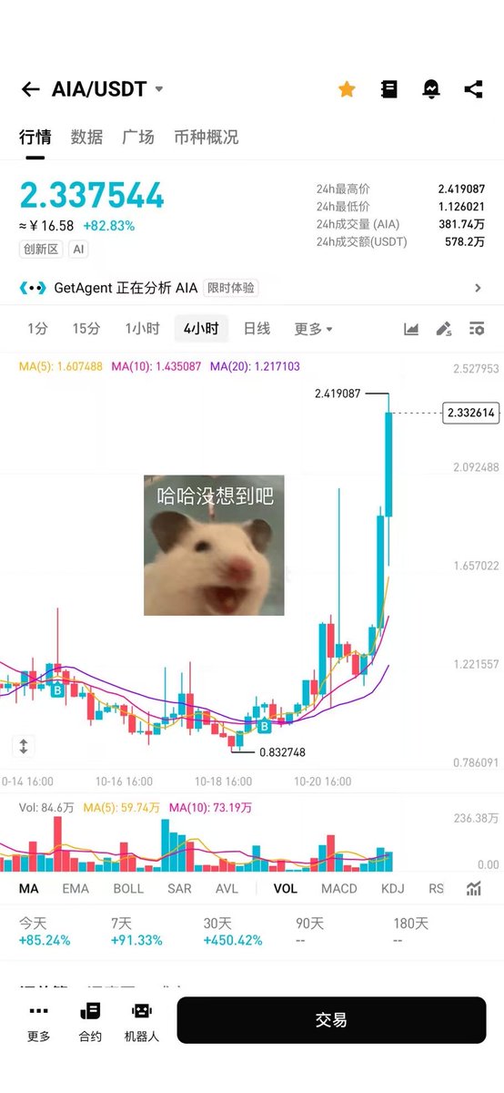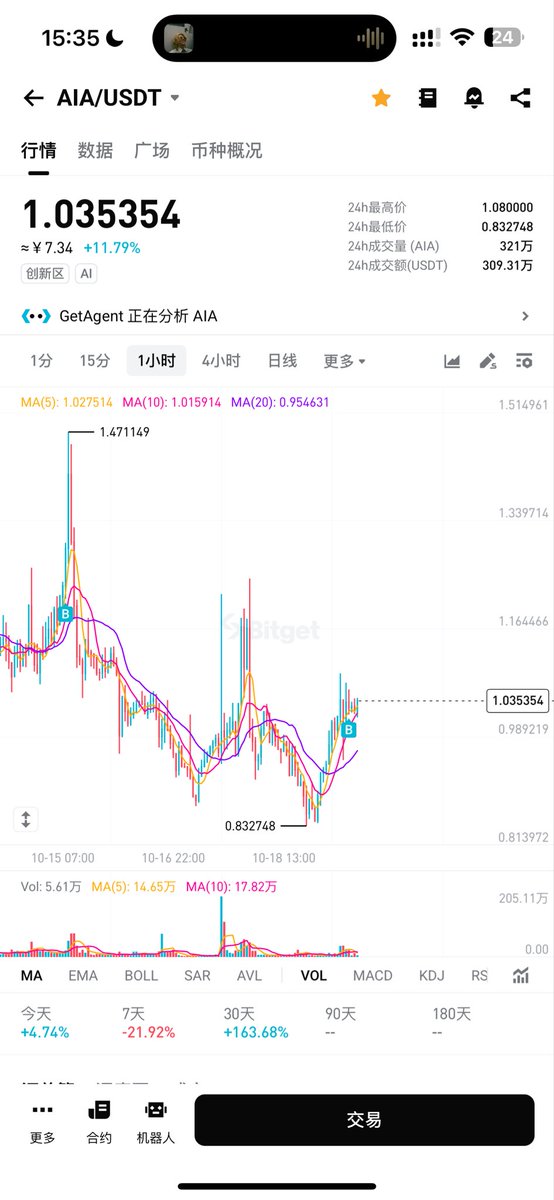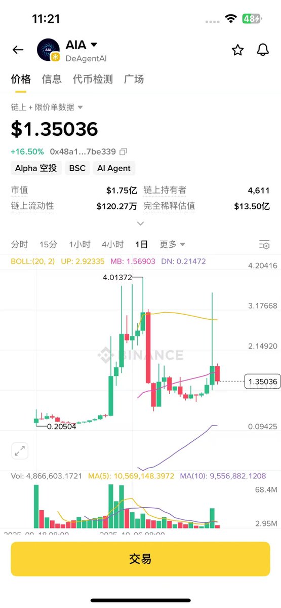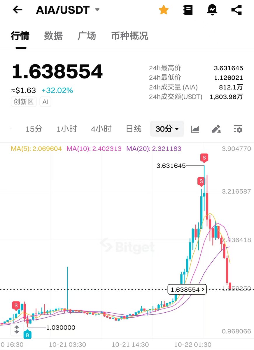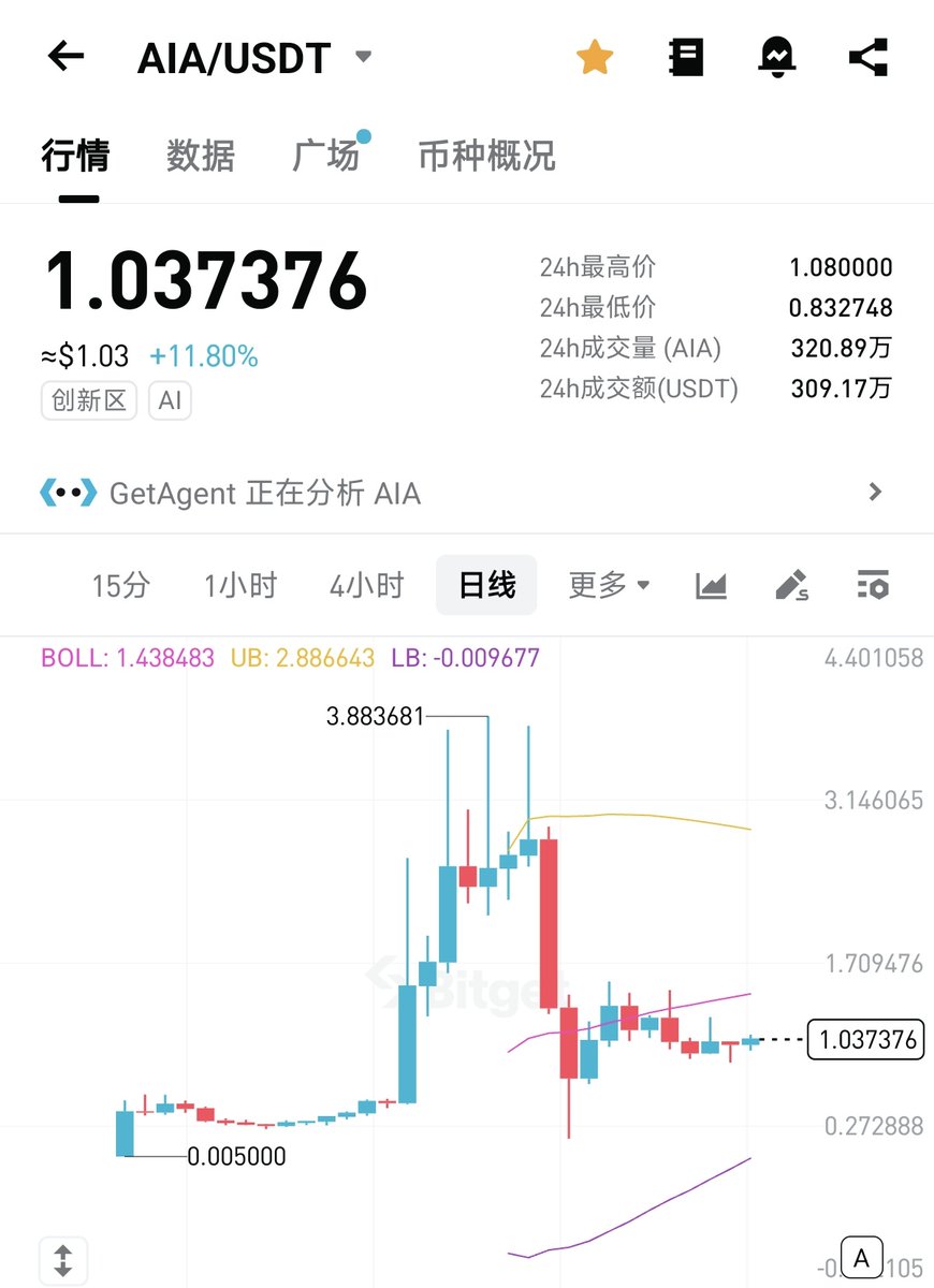 $AIA 上线后,从 0.4U 一路拉到 4U,经历黑天鹅后又回到 1U,最近从底部反弹了 30%。