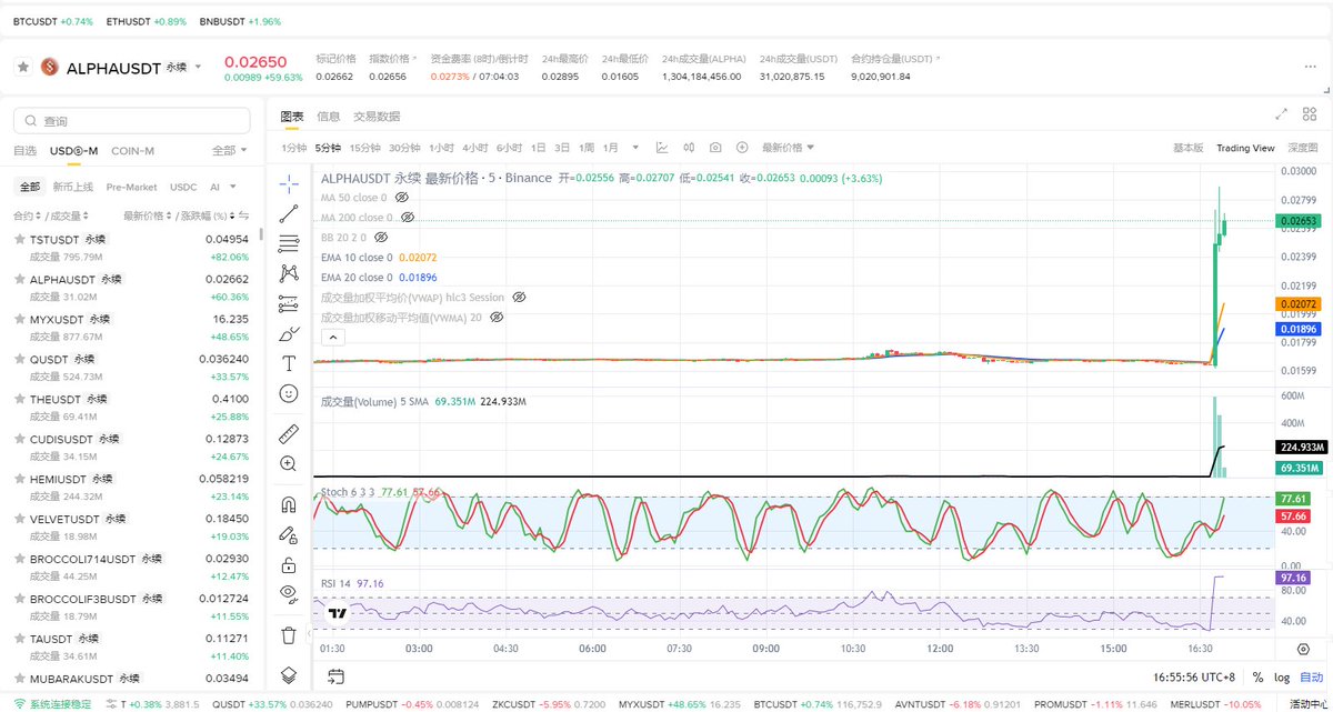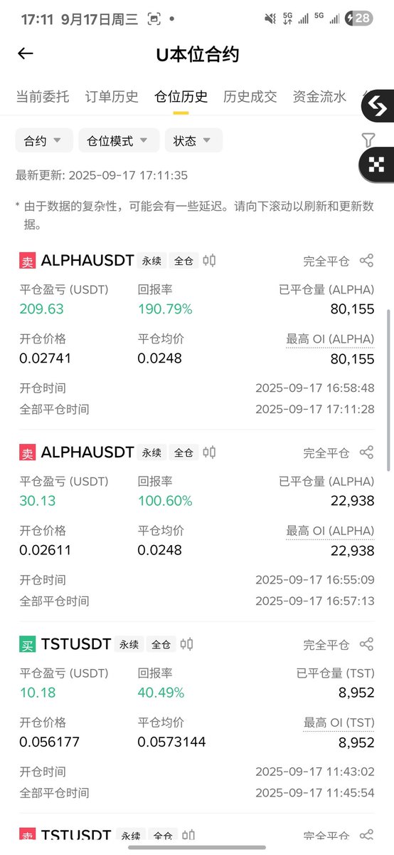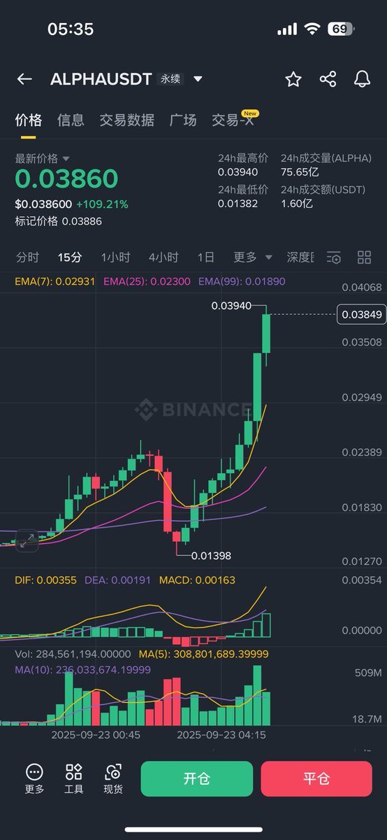 $alpha 合约做多,0.61开最高0.12,0.82平了锁了利润,部分滚仓,总盈利过万刀。