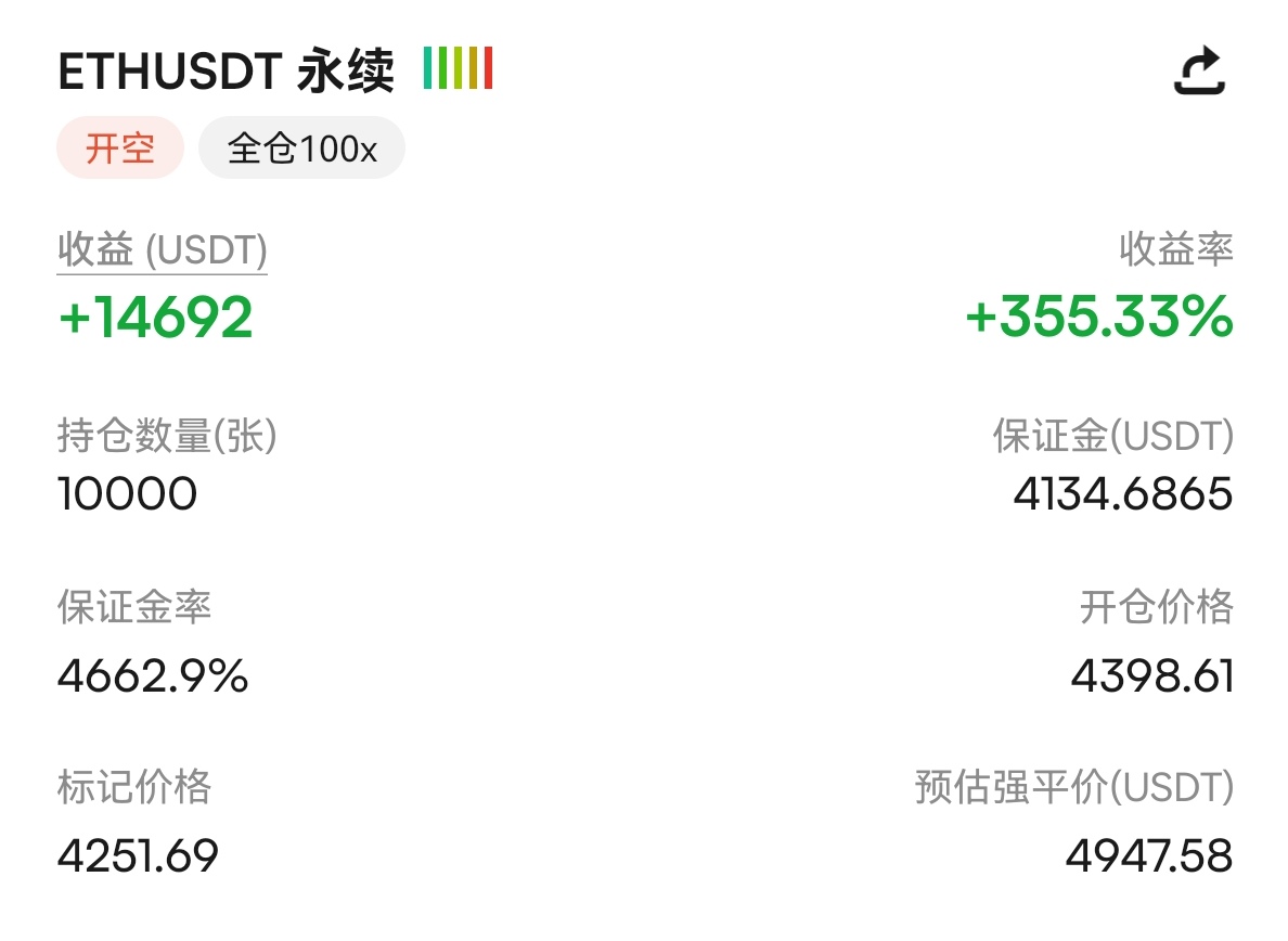早上止盈以太以后。10点多我又多进去了。目前浮赢100点,舒服啊,
