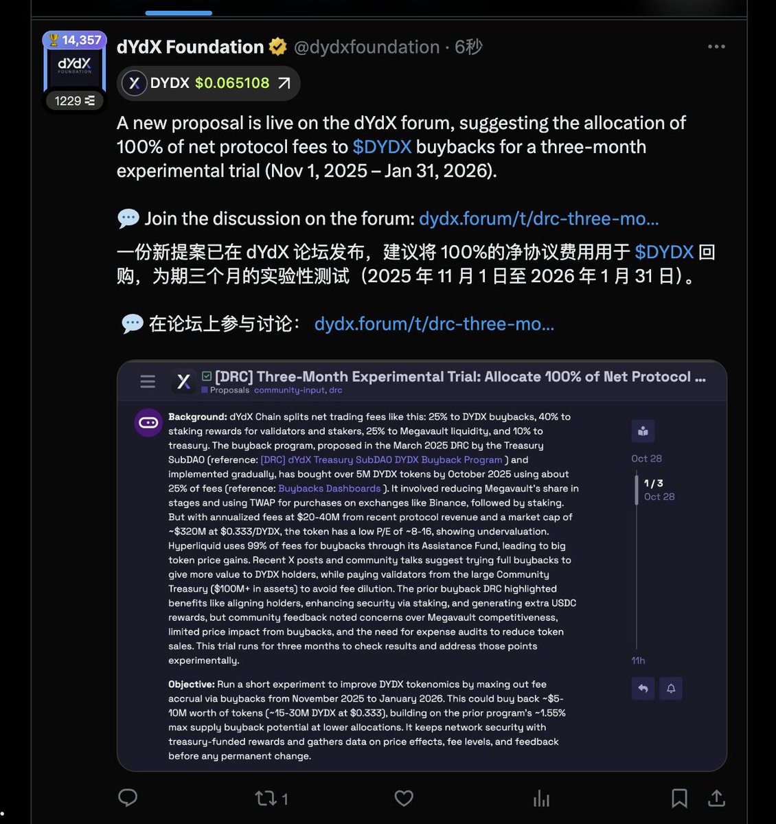 在其他perp dex token 大幅回撤的情况下,APEX依然维持在1.3左右的价格。其中自然不无交易挖矿手续费回购的功劳。