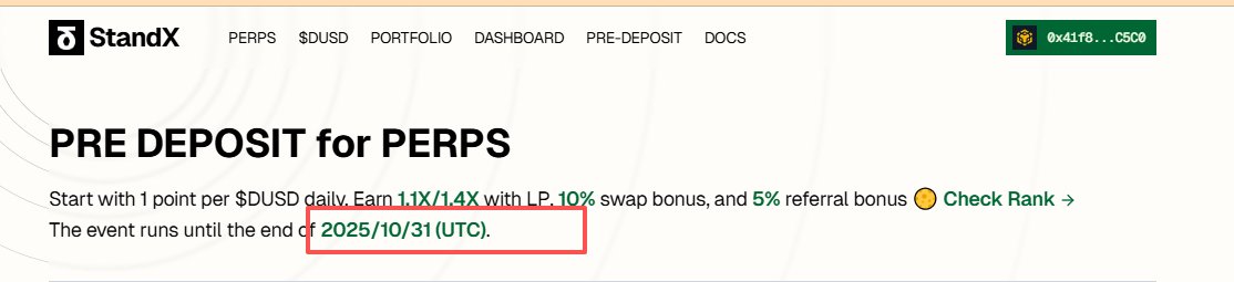 Aster $AST 的持续拉盘无疑把PERP赛道再次推上了高潮,上次PERP赛道的高潮还是 $HYPE 其实我个人目前参与的PERP赛道的项目就只有 Aster和Standx,在Aster TGE之后,一天时间StandX注册人数增加了接近1000人。足以看出现在大家对PERP赛道的狂热。 众所周知,StandX的CEO AG 联创@StandX_Justin 两位都是原币安合约高管出身的,要技术有技术,要经验有经验,有人脉有人脉。 虽说我不知道PERP赛道还能走多远,但目前来看PERP赛道是今年不能错过的赛道。 而StandX的Pre-Deposit 活动将于10月底结束,这是不是意味着算是最后上车的机会?