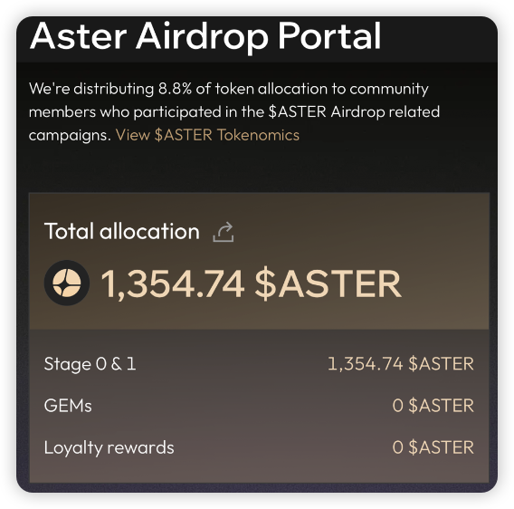 我的天,感谢巫师提醒。去翻了一下钱包发现还真有空投奖励。拿了 1354 个 ASTER 😆 我记得是很早之前参与 BNB 理财的 如何查询空投: 1、打开币安钱包-【发现】 2、上方地址栏搜索-输入【Aster】 3、找到【ASTER Airdrop checker】 4、连接钱包、签名【claimed】 5、领取以后点击【check balance】 6、就可以直接跳转页面卖出,之后可以在个人中心提现到钱包即可