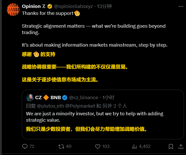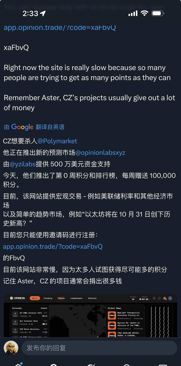刚才CZ表哥回复了一个老外,这把 @opinionlabsxyz 更加火🔥了😂😂😂