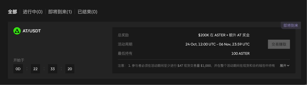 用户交易 AT/USDT 满额、持有 $ASTER,就能参与奖励分配。