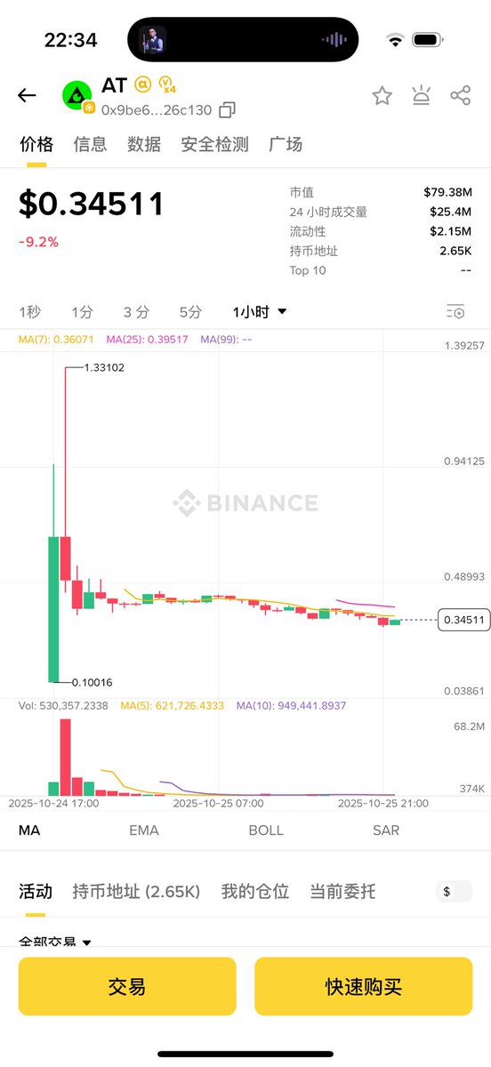 $AT 开盘插针 $1.3 ,现价 $0.8 , FDV直接冲击 $1B ,太狠了,不愧是CZ奶的高手项目。