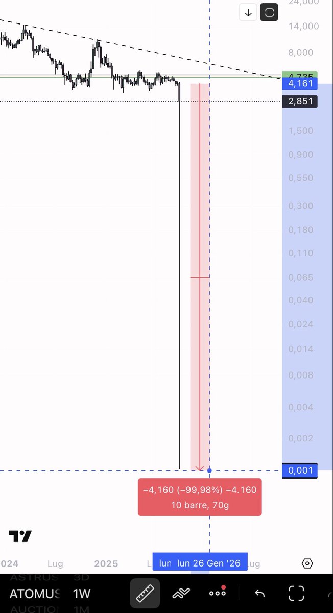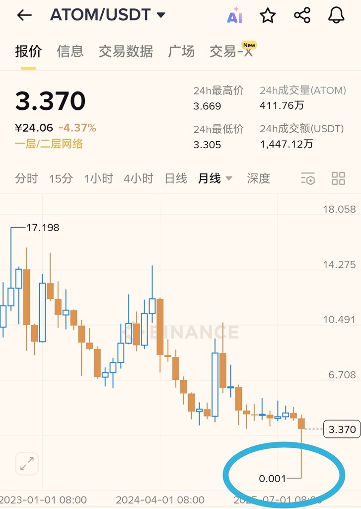 其实几天前我就看到币安公告,说部分 K 线数据异常、后续会修正。但没想到修改得这么草率。比如下图的 $ATOM ,修改前最低价是 0.001,修改后变成 1.54,足足差了 1500 倍。
