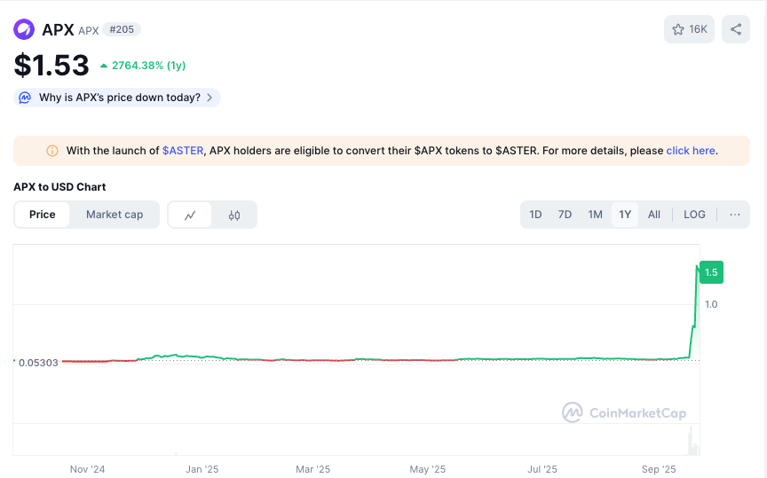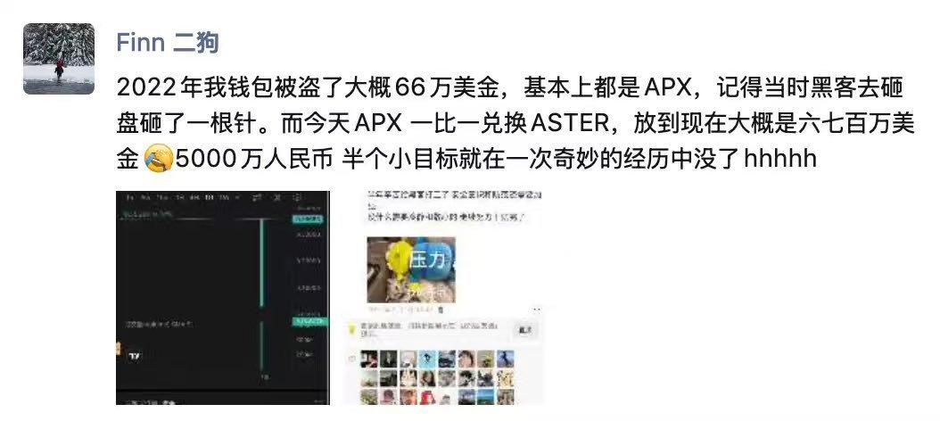 APX成立于2021,在过去四年里是狗哥坚定看好且陪伴成长的项目2022年钱包被盗 大量APX丢失,后续又慢慢买回部分,2025 APX品牌升级Aster,其 $APX 代币 1:1兑换成 $AST