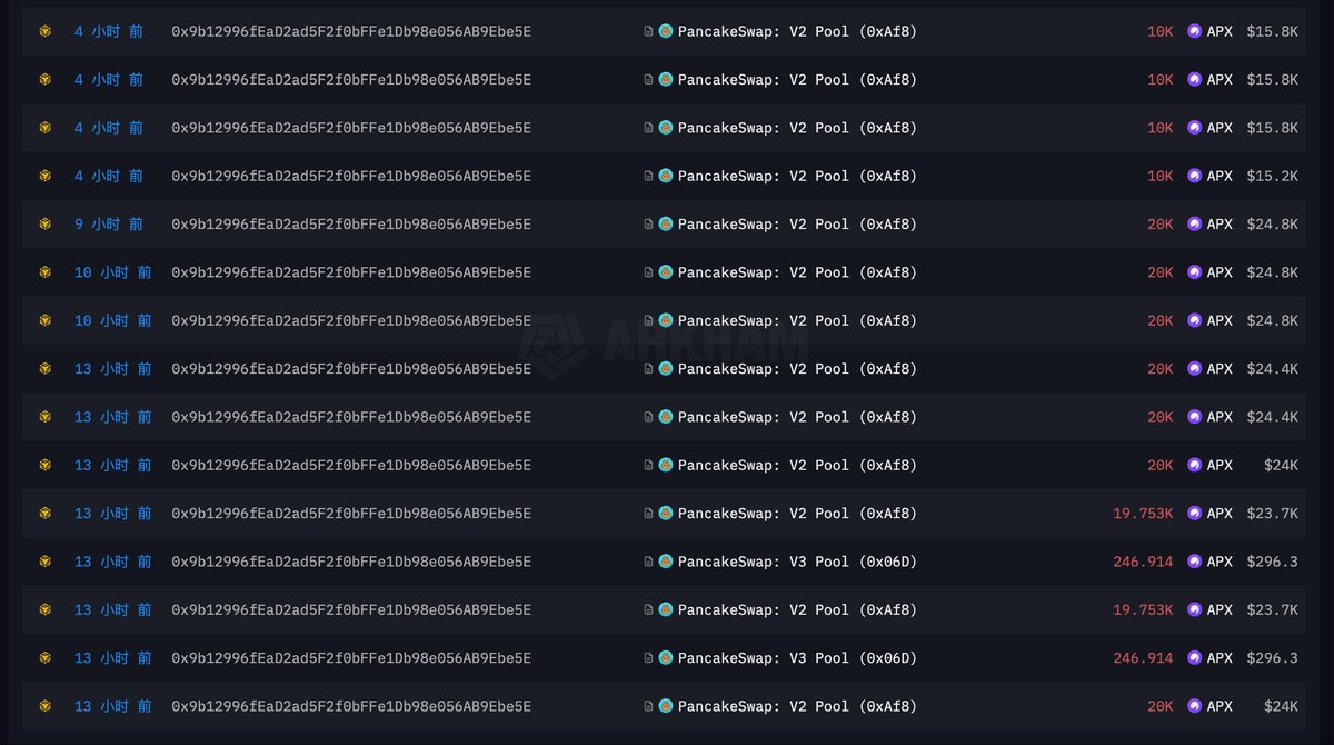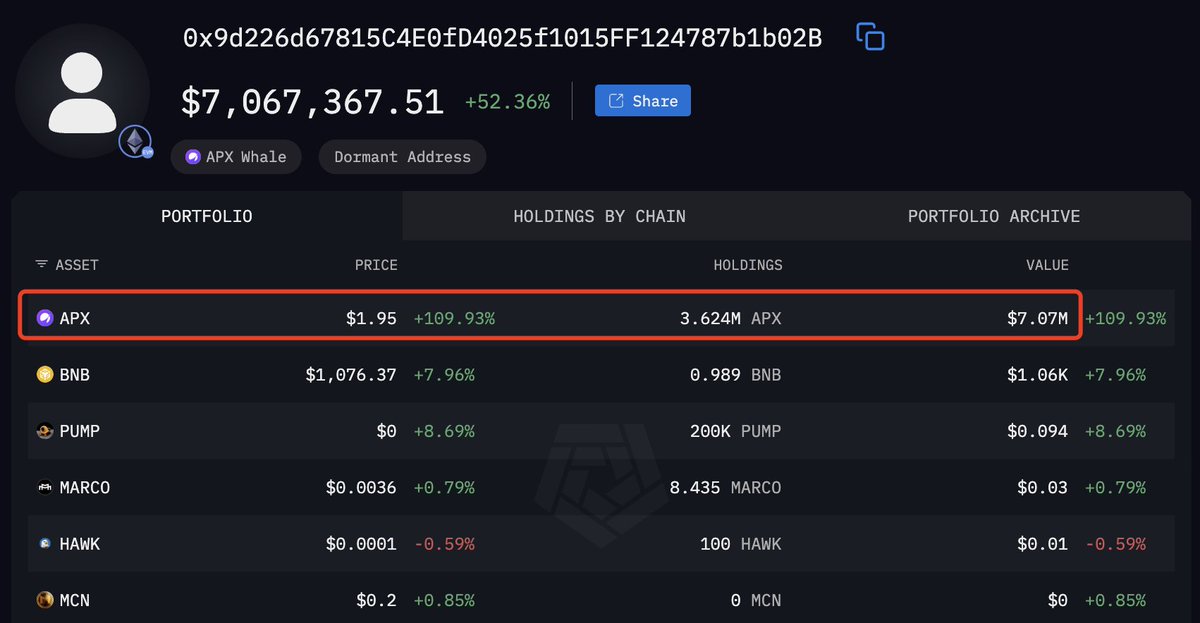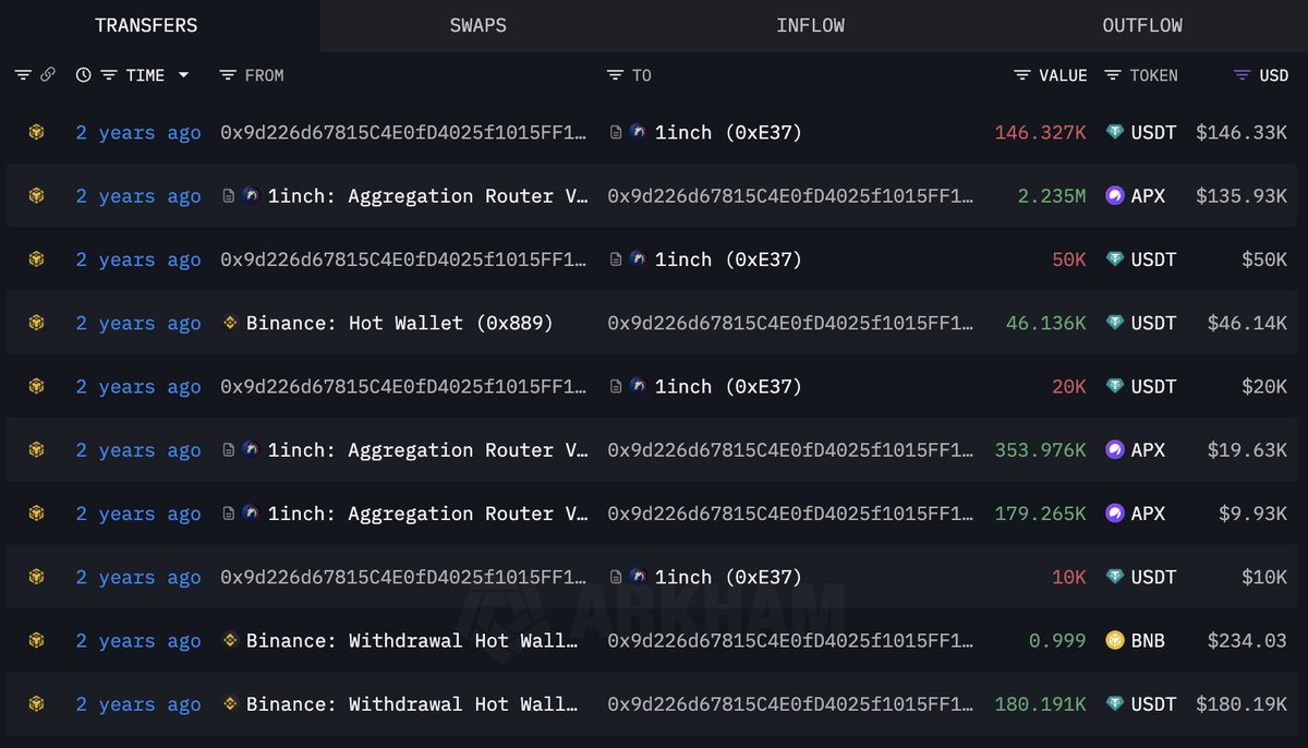 一个地址在 2 年前 (2023/11) 用 22.6 万 USDT 购买了 362.4 万枚 $APX ,均价 $0.06。购买后一直放在钱包里没动,休眠了 2 年时间。