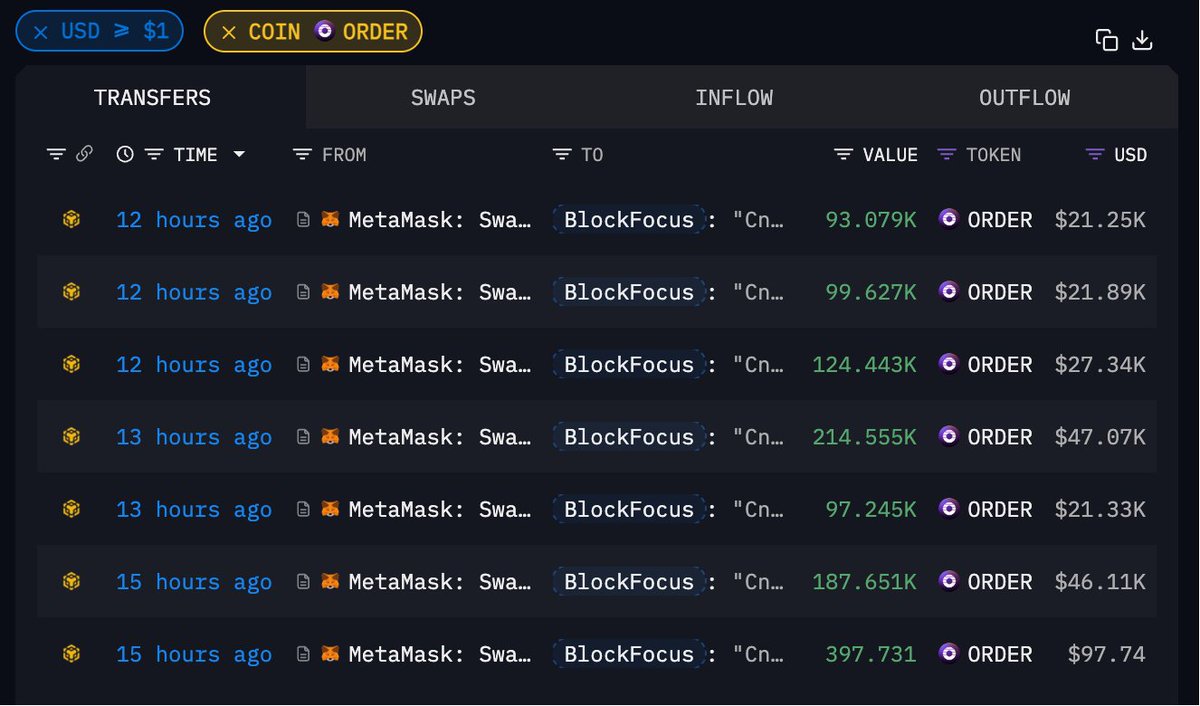 过去 15 小时他们花费 18.5 万美元买入 81.7 万枚 ORDER,均价 $0.2265,目前已成为其链上 TOP1 资产