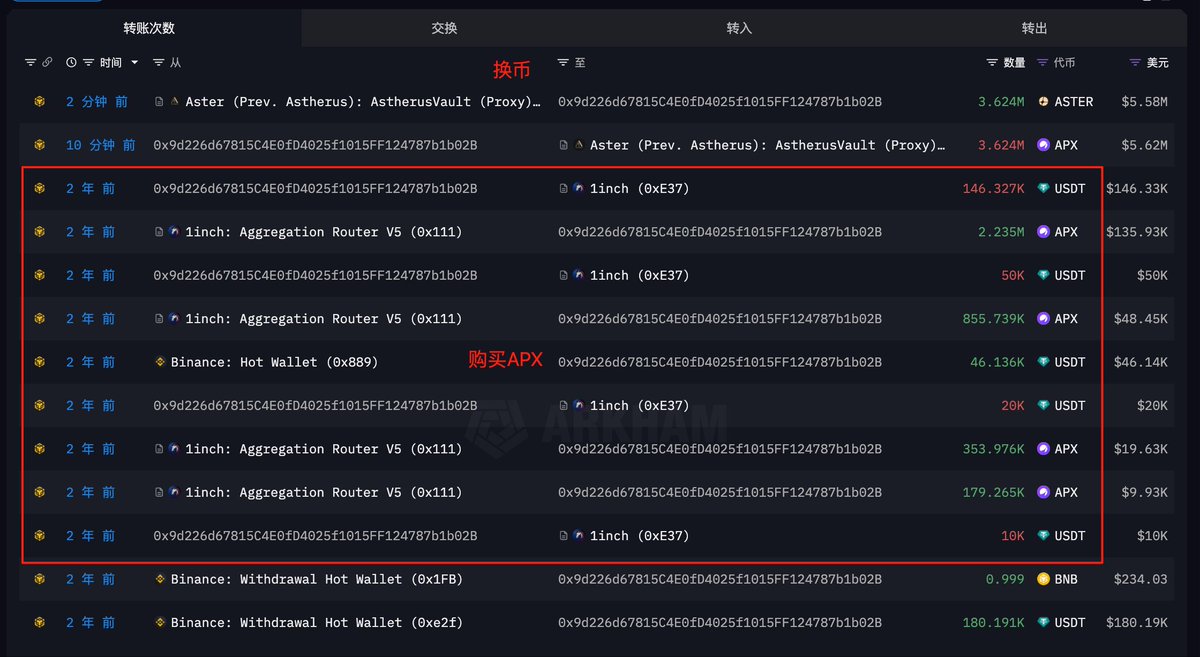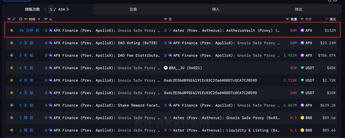 10 分钟前,他把这 362.4 万枚 $APX 转进 Aster 1:1 换回了 $ASTER 。而现在这些币价值已经变成了 $562 万。