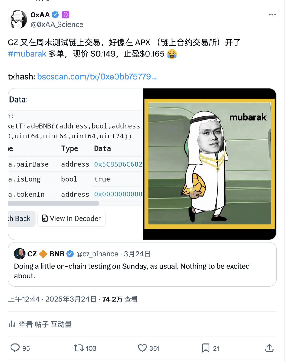 半年前还是 #mubarak 时期,有一天(2025.3.24), @cz_binance 的链上公开钱包发了一笔和 mubarak 相关的交易,我去链上看了下,发现是在杠杆做多 #mubarak ,然后写了这篇推文。