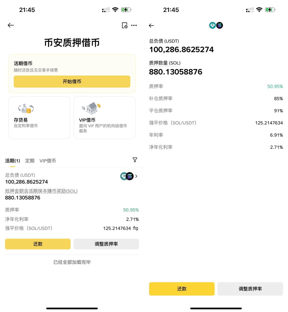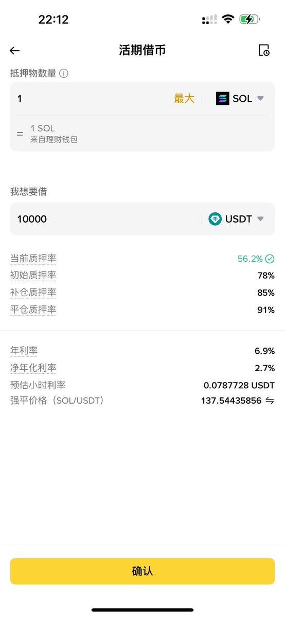 另外我大概看了一下,主流的资产借贷中 SOL 是利率最低的了,综合利率只有 2.7% ,而 $BTC 和 $BNB 都超过了 6% , $ETH 是 5.7% ,这也是我选 SOL 的原因,其它的就亏死了。