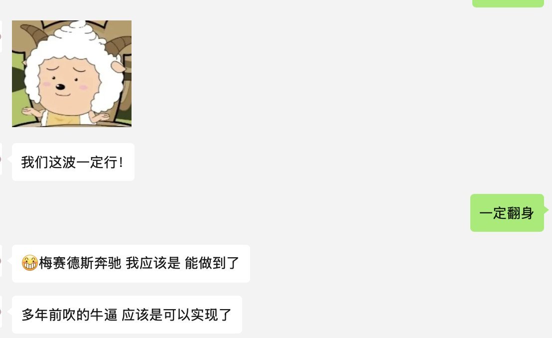 那时候大概买了70W个,均价多少我已经忘了,而他买完之后选择了锁仓四年,那时候还很平淡的说就当我买彩票了,还许了一个至今都让我觉得是个梦的承诺,即梅赛德斯奔驰!