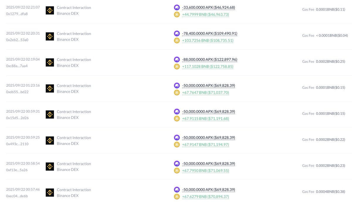 两年前质押 1330 万枚 $APX 的鲸鱼,在最近四天里出售了 907 万 APX 换回 $227 万 U,出售均价 $0.25。
