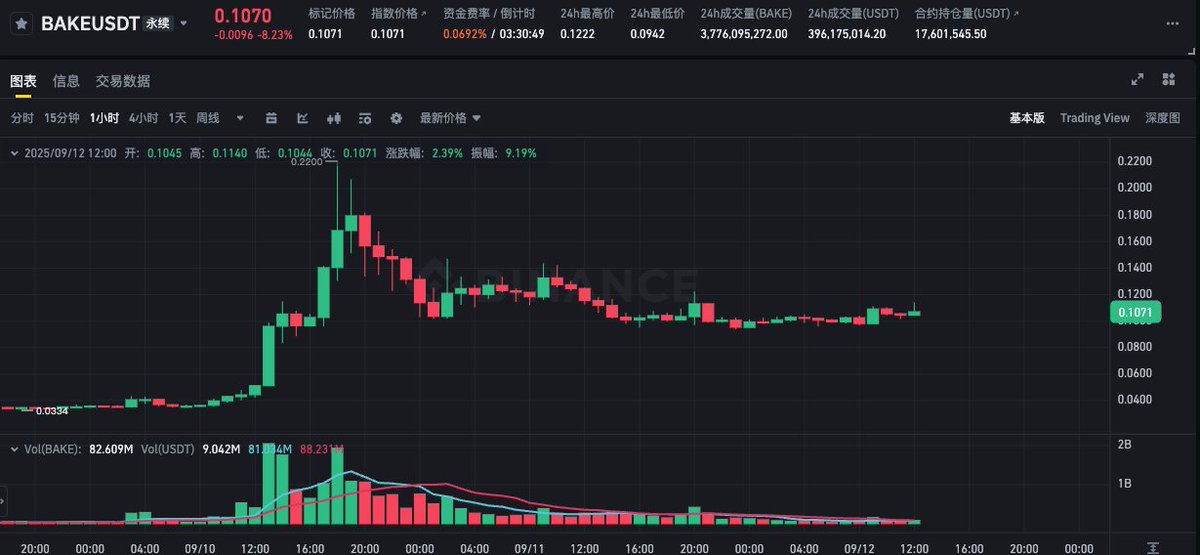 $bake 下架概念,从0.03到0.12,交易所的一天四倍,还是很舒服的,但是也属于刀口舔血,因为现在,根本不知道谁在做空,合约持仓量都不多,做多的偏多,资金费率也是正的