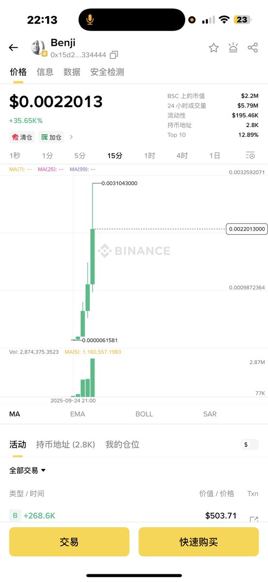 今晚 bsc $BENJI 频道里的人吃到了 妈的 10k 看到不敢买 500k 去追高 更多早鸟进频道 :