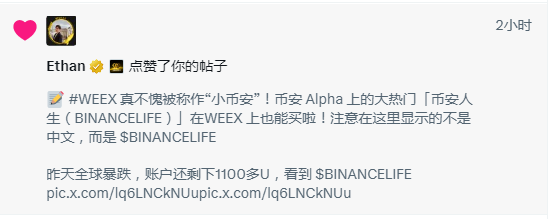 📝 #WEEX 真不愧被称作“小币安”!币安 Alpha 上的大热门「币安人生(BINANCELIFE)」在WEEX 上也能买啦!注意在这里显示的不是中文,而是 $BINANCELIFE