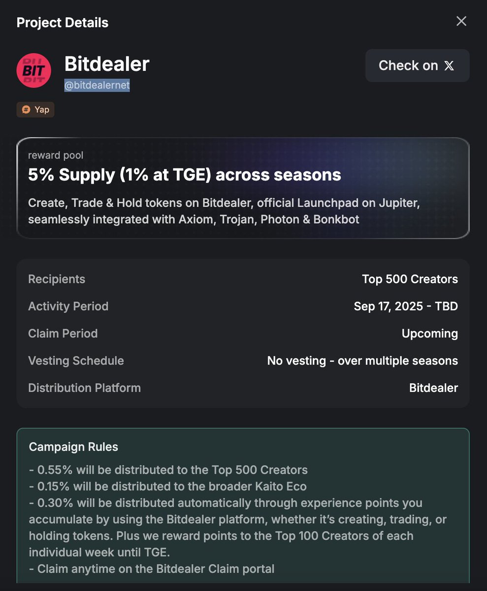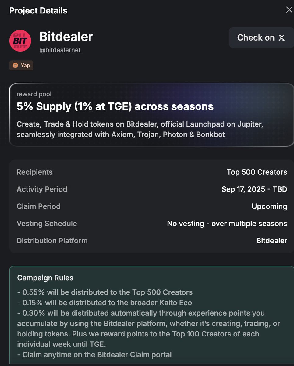 9月17日到TGE期间,你在 @KaitoAI 上发布有关 Bitdealer 的内容(分析、更新、项目观点),AI会自动识别你的内容质量和互动热度。