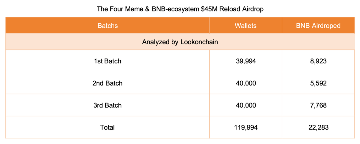 到目前为止,@BNBCHAIN 和 @four_meme_ 的 4500 万美元重新加载空投已分 3 批向约 12 万个钱包空投了 22,283 美元 BNB(2478 万美元)。