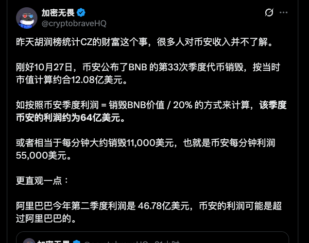 如果按约 30–40% 利润率(历史推测),币安季度净利润大致 8–10 亿美元 较为合理,一年利润接近40亿美元。