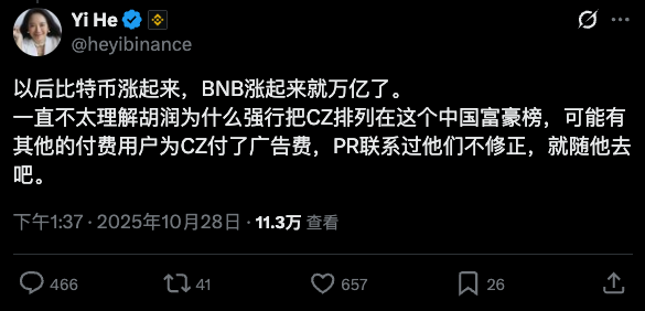 而且CZ现在国籍早就不是中国了,这次上胡润的中国榜单挺有意思的,看 @heyibinance 一姐怎么说的: