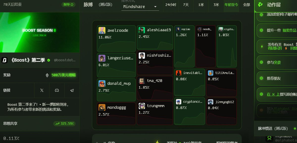 兄弟们,涨还跌就看明天了 没行情来看看@boostdotgg@PulseInfra平台上搞了一个活动 奖池还是不错得,有500W $boost ,当前价格 $0.085 以上币安Alpha, 感兴趣得朋友可以一起玩 注册链接:
