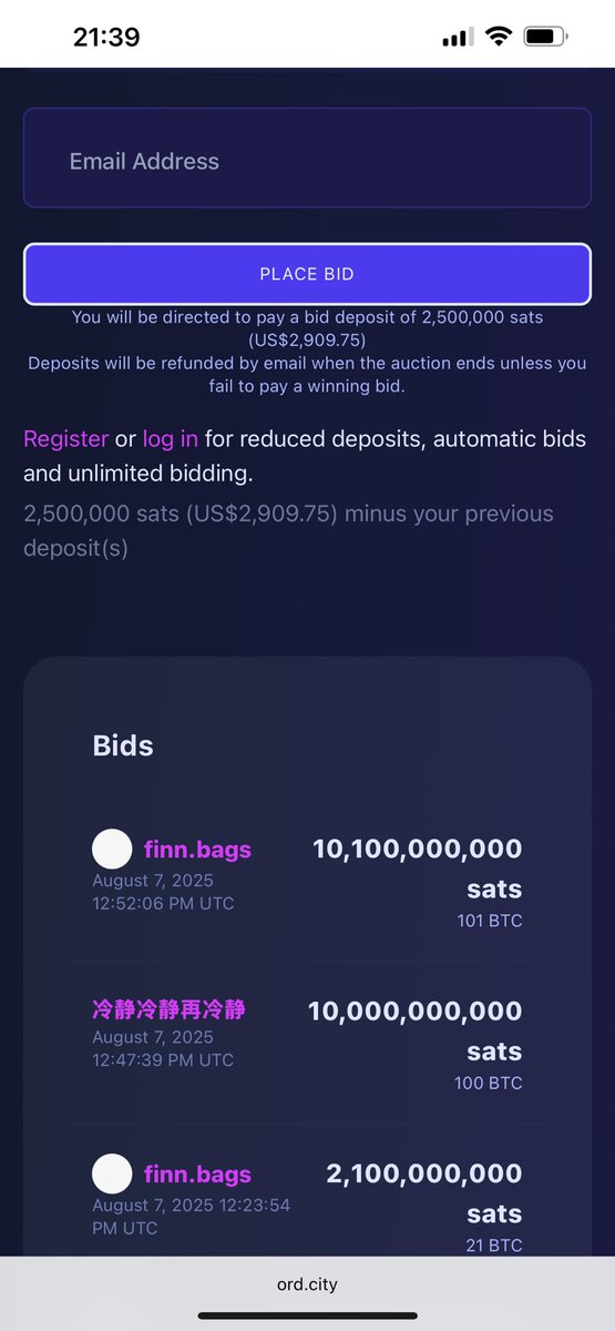 7 答案出在这个狗几把网站虽然出价100个比特币 但是不用真有100个 只要3000美金的押金就可以随便出价 但是我不知道出1万个比特币是不是也是3000美金
