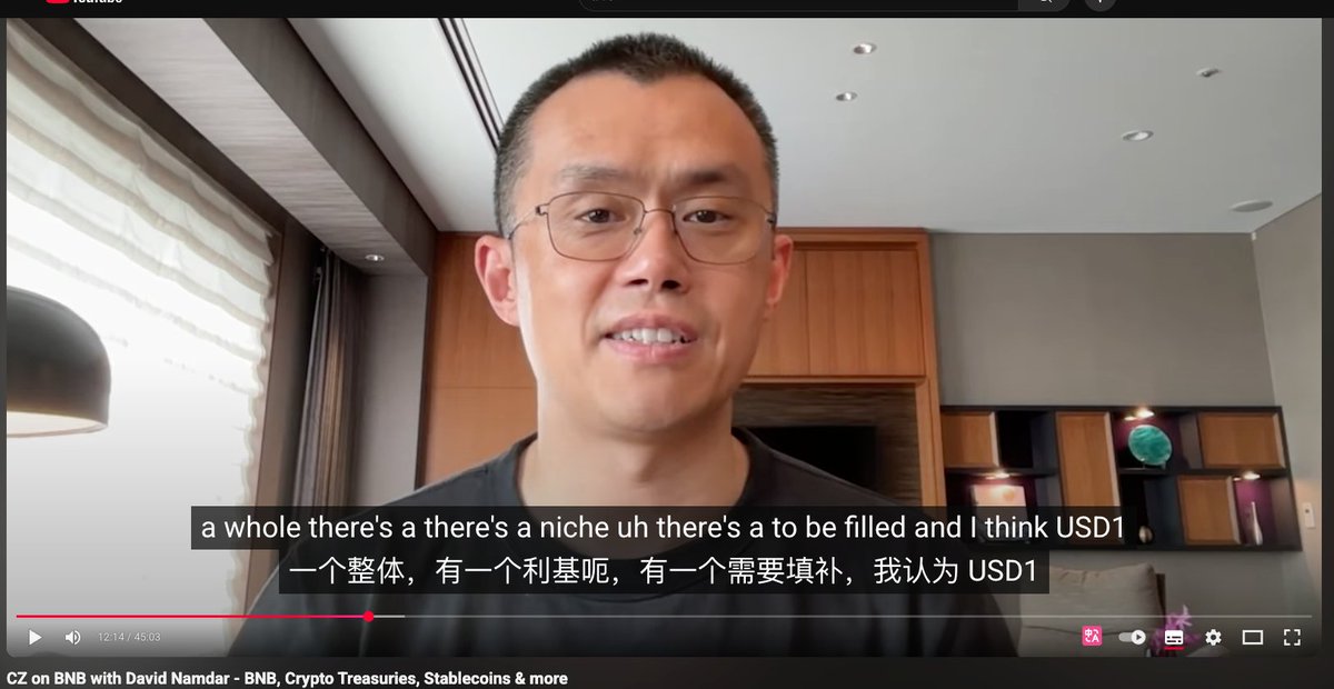 (我觉得这是采访中一个很有价值的内容,这是第一次我看到 CZ 主动诠释了他对 USD1 的看法,而不再需要市场的无端猜测。