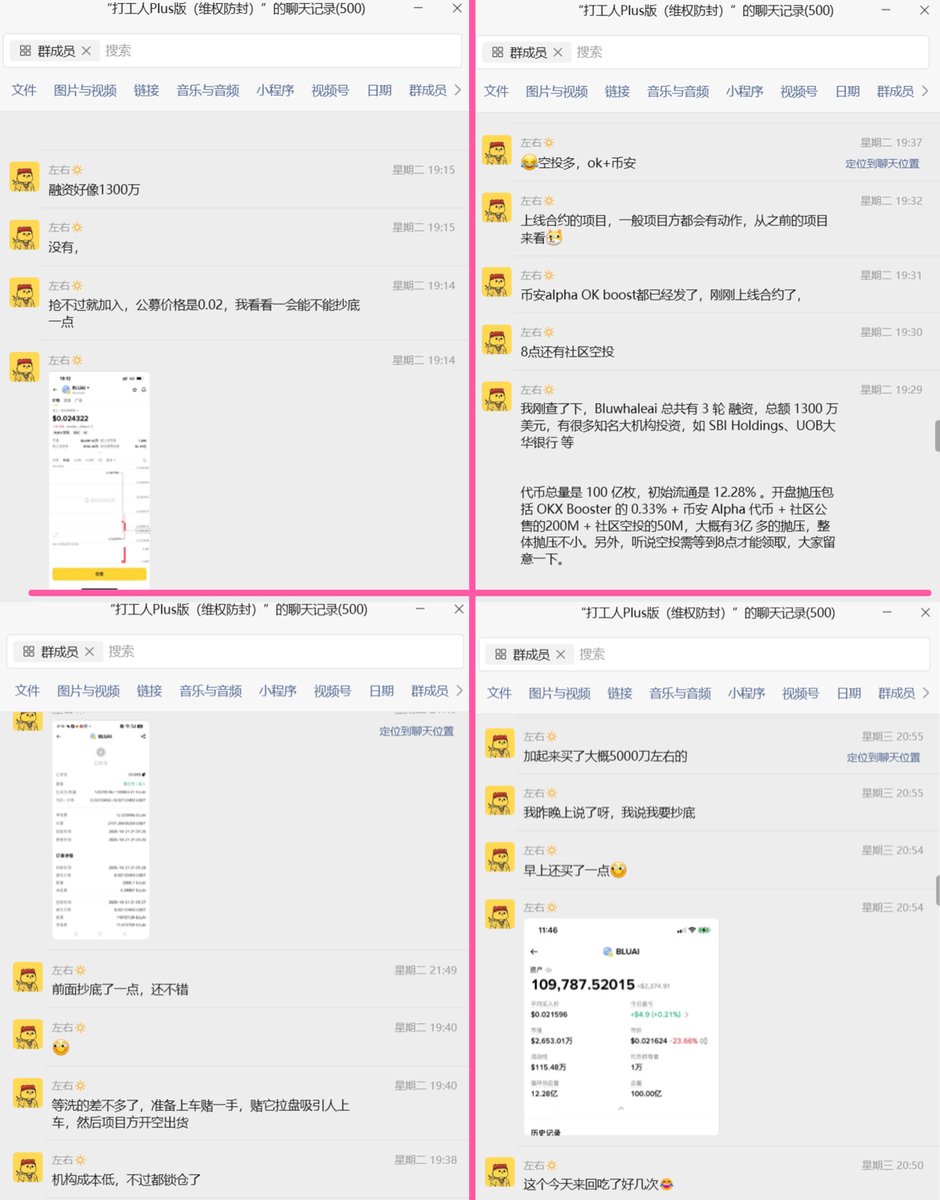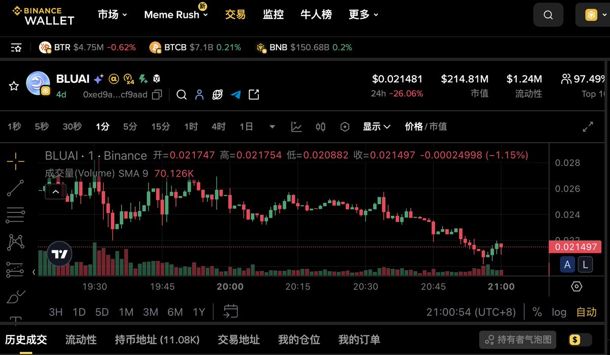 $bluai 这个币,洗的我无语。 本来有6w刀的持仓,给我洗没了。 预期: 公墓融资成本0.02+只有5%的筹码。 0.0236头仓,这里跌倒0.021很多群友要补,我没有补,在0.02进行的补仓。 合约中有个很大坏习惯就是跌了补,但是不知道为什么补。 如昨日 $币安人生 我的补仓点的选择和今日新币的选择思路是相同的。 一味跌了补很容易补到没有保证金,轻则仓位太大回本就想好,重则补不动爆仓。 当然我也被他洗没了,只有一万多刀的仓位。 我交易风格比较怂,求稳,小赚一点饭钱。 整个过程公开,见评论区。