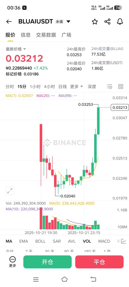 前俩天在群里喊大家让买的 $BLUAI 今天早上起飞了,当时就觉得这个币潜力不错,上市价有点低估了,可以适当的博弈一手。 $BULAI 币价从低点但最高价接近翻倍,我的平均买入成本应该是在0.215 左右,期间还做过多次波段,虽然说波飞了部分币,但无伤大雅。 币安 Alpha 里果然还是有非常多的潜力币可以挖掘,大家有好的标记得喊下我,一起上车~ @binancezh @BinanceWallet #Binance
