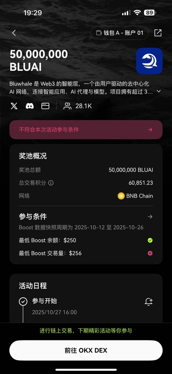 OKX Boost又来送钱了,这次小毛 ➣这期我倒是交易蛮多的,用钱包买卖了不少代币,拿了3.95分,预期分50刀吧 本次项目 @bluwhaleai 5000万枚 $BLUAI 24小时内点下参与按钮就可以 没绑定OKX DEX的绑定下 https://t.co/San12H4fnT 永久减免20%手续费 邀请码54321 @okx @star_okx