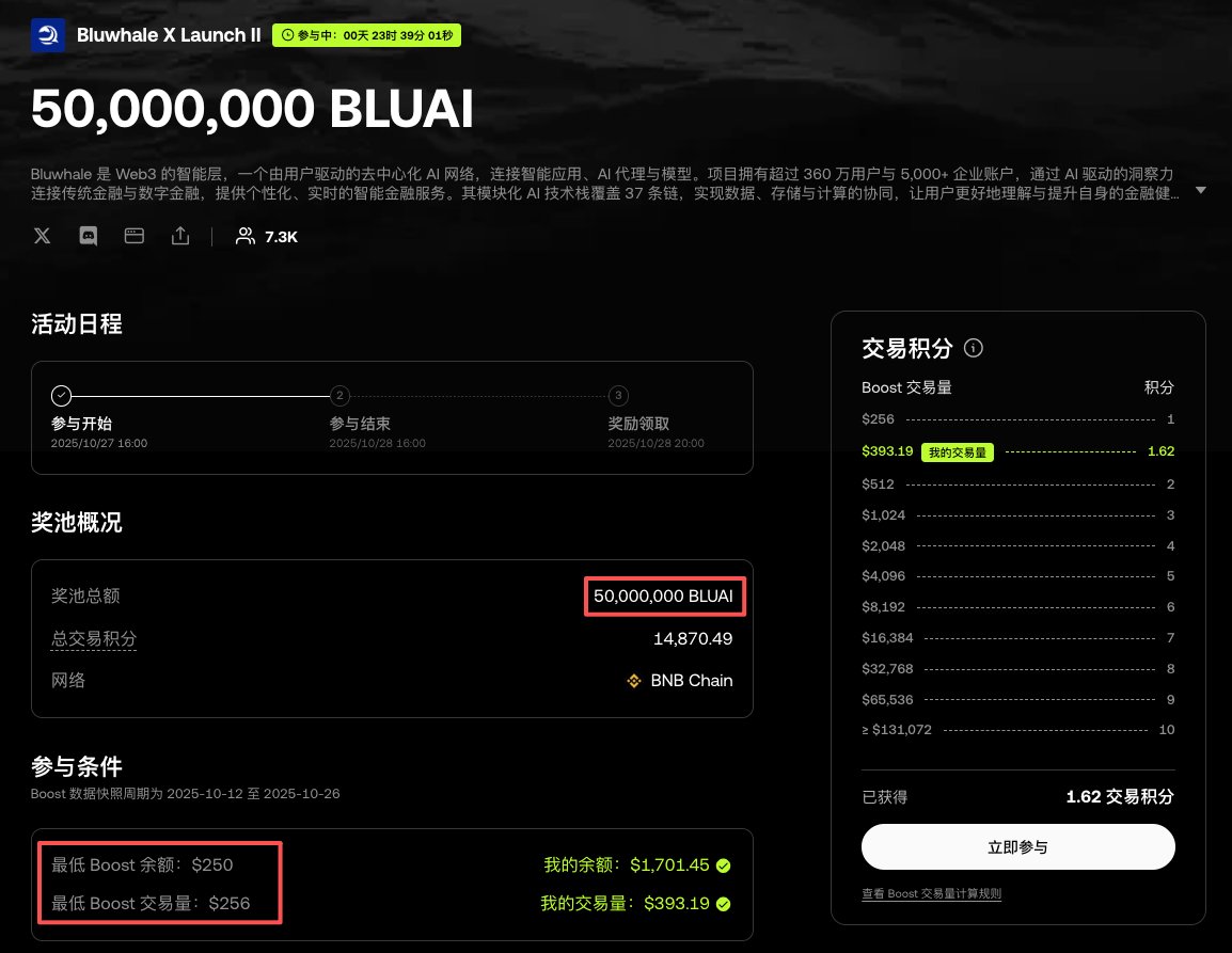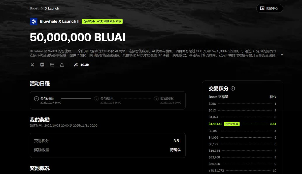 兄弟们,OKX Boost 又上线了X Launch 活动,奖池是 50,000,000 $BLUAI ,大家记得投入积分参与