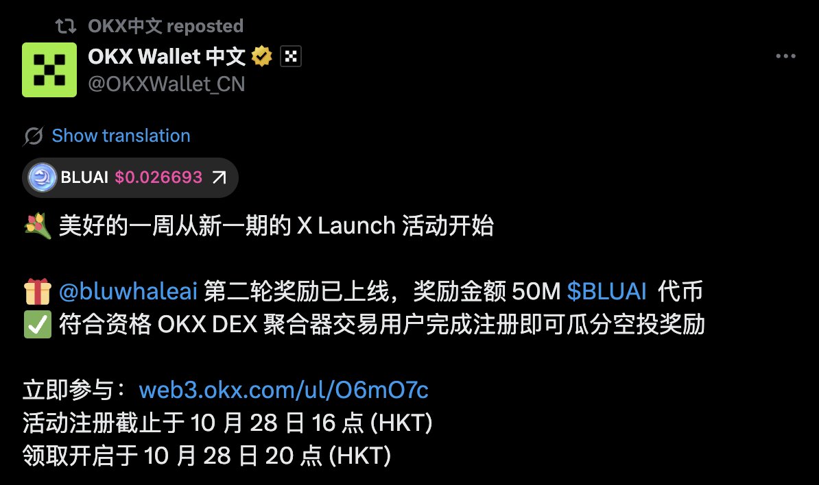 💐 美好的一周从新一期的 X Launch 活动开始 🎁 @bluwhaleai 第二轮奖励已上线,奖励金额 50M $BLUAI 代币 ✅ 符合资格 OKX DEX 聚合器交易用户完成注册即可瓜分空投奖励 立即参与: 活动注册截止于 10 月 28 日 16 点 (HKT) 领取开启于 10 月 28 日 20 点 (HKT)