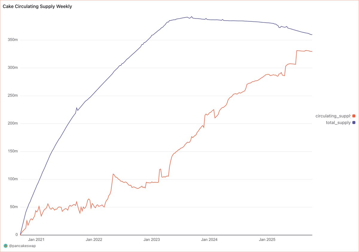 $FORM 就把它当作一个强庄币来看就好,情绪好的时候拉盘那就是要出货,真正要搞事情的话得在情绪不好的时候拉盘,性价比最高。 另外, $CAKE 的总供应和流通量越来越接近了,前期存量已经消化差不多。