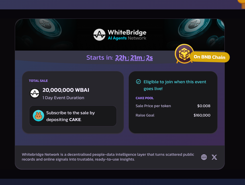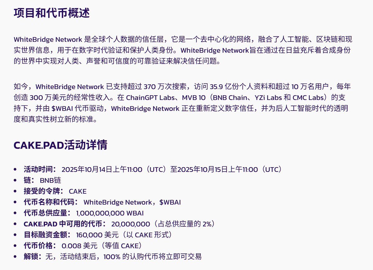 🚨 WhiteBridge Network CAKE.PAD 上线了! 🚨 在 PancakeSwap 上提交您的 $CAKE 并领取您的 $WBAI (@AiWhitebridge) 份额。 ⏳ 世界标准时间 10 月 14 日上午 11:00 – 世界标准时间 10 月 15 日上午 11:00 🪙 总池数:20,000,000 $WBAI 🏷️ 每个代币价格:0.008 美元
